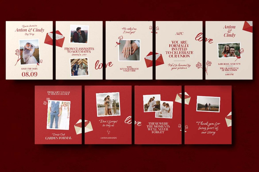 Celebrate love in style with this Wedding Instagram Carousel Template, designed to help couples, wedding planners, and creative vendors share stories, announce dates, or promote wedding services through stunning visuals.